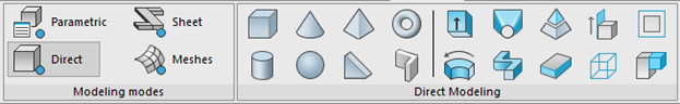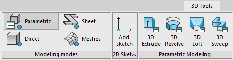 Quando os usuários alternam entre tipos de modelagem, a faixa de opções muda automaticamente os comandos exibidos para aqueles específicos ao modo de modelagem selecionado. Por exemplo, quando um usuário seleciona o modo de Modelagem Paramétrica, a faixa de opções muda para mostrar comandos para criar geometria 3D com base em esboços paramétricos.