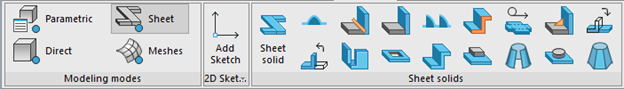 As ferramentas básicas (Chapa sólida, Dobrar borda, Dobrar sobre segmento e Dobrar por esboço) criam peças padrão a partir de chapas metálicas. As dobras podem ser dobradas e desdobradas a qualquer momento, e os cantos são tratados por uma variedade de alívios e dobras.