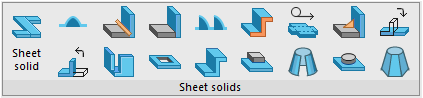 Para peças específicas de chapa metálica, existem as ferramentas Shell e Ruled shell, além de ferramentas adicionais que adicionam rapidamente elementos de chapa metálica comumente usados, como estes: